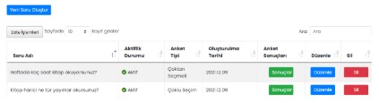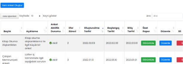Oluşturulmuş anketler ve anket raporları burada gösterilir, düzenlenir ya da silinir.