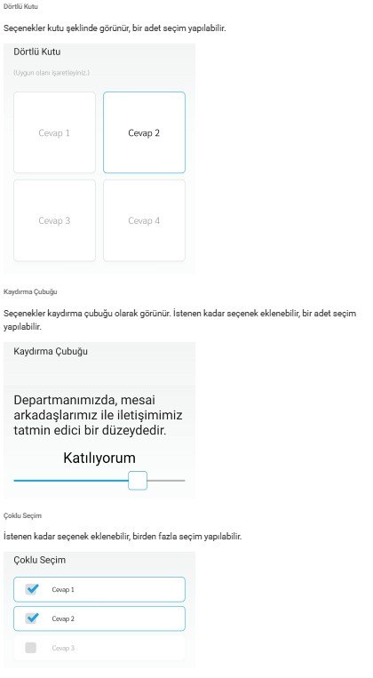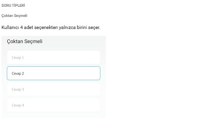 Soru Tipi Seçiniz: Aşağıdaki tiplerde soru oluşturulabilir. Soru tiplerinin uygulamada nasıl göründüğünü görmek için bkz: Soru Tipleri