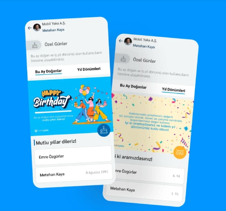 Mobil uygulamanın sağ üst menüsünden ulaşılabilen Özel Günler sayfasında, çalışanların yaklaşan doğum günü ve iş yıl dönümleri listelenir.