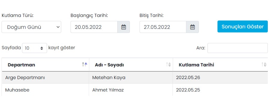 Yıl Dönümleri: O gün iş yıl dönümü olan kullanıcılar, en uzun yıldan beri firmanızda olan çalışanlar başta olmak üzere listelenir.