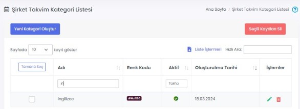 Takvimde görünecek etkinlikler için kategoriler tanımlanabilir. Kategorilere farklı renkler tanımlayabilirsiniz.